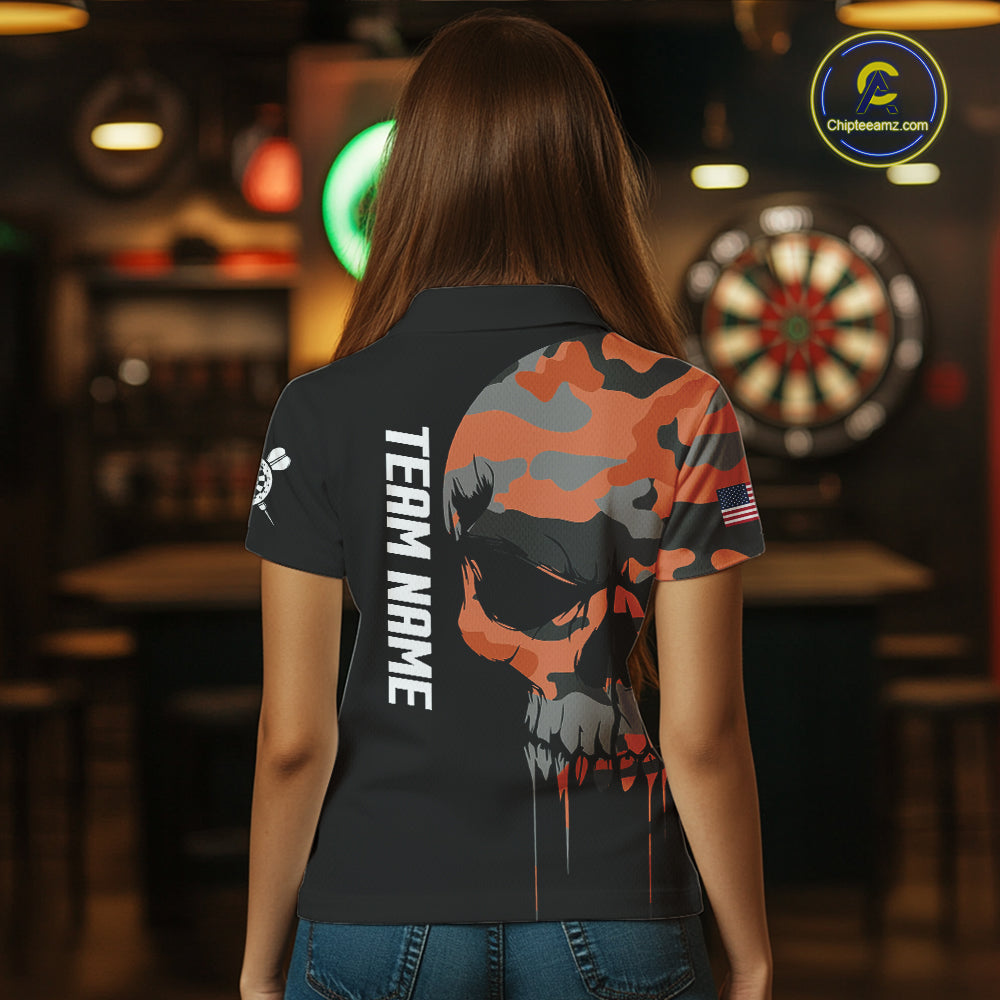Orange Camouflage Skull Darts Shirt For Women Custom Patriotic US Flag Darts Jersey Polo & 1/4 Zip TDM5298