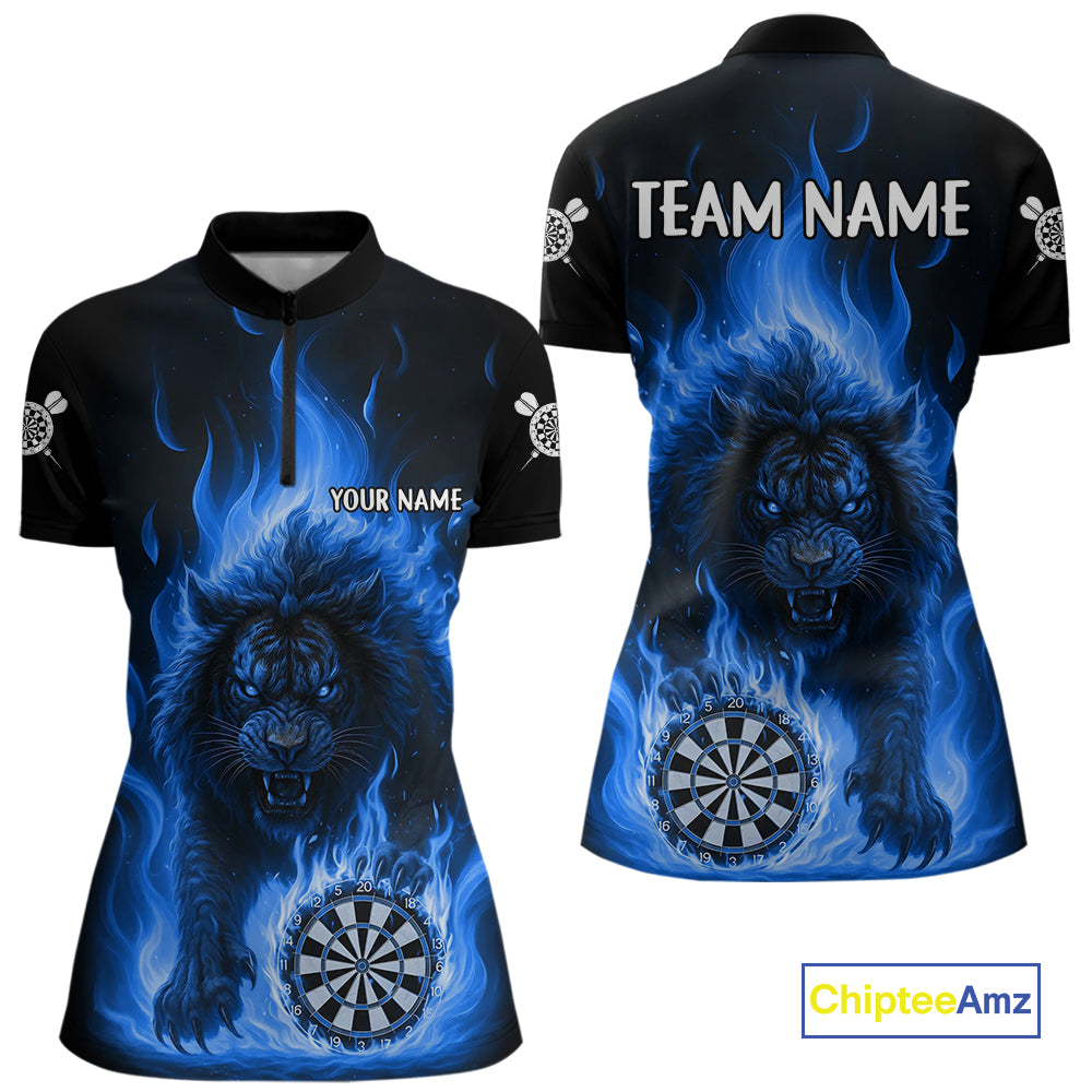 Blue Flaming Lion Darts Shirts For Women Custom Fire Darts League Jersey Team Polo & 1/4 Zip TDM5309