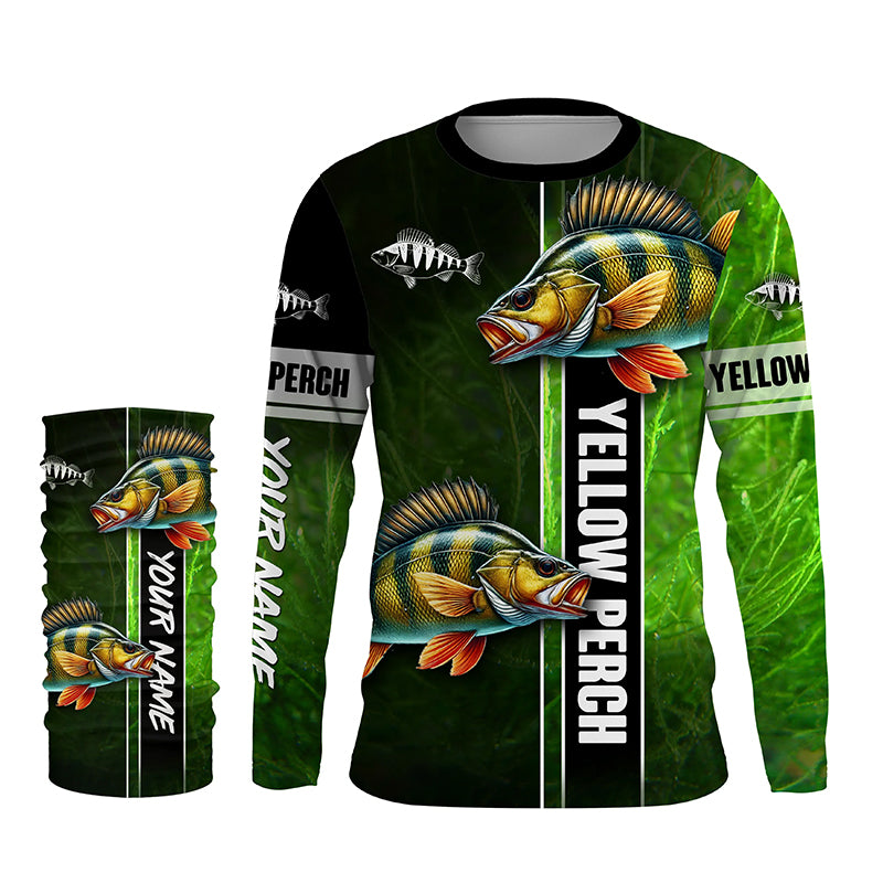 Yellow Perch fishing green camo Custom Long Sleeve Fishing Shirts, fishing gifts for men, women, kid NQS5812