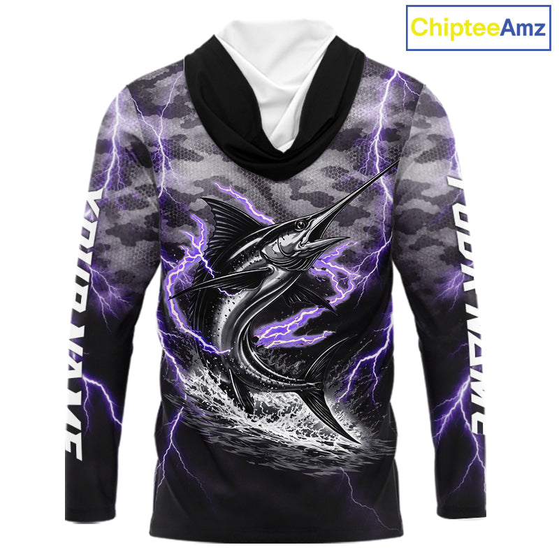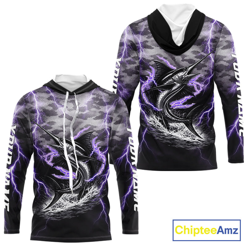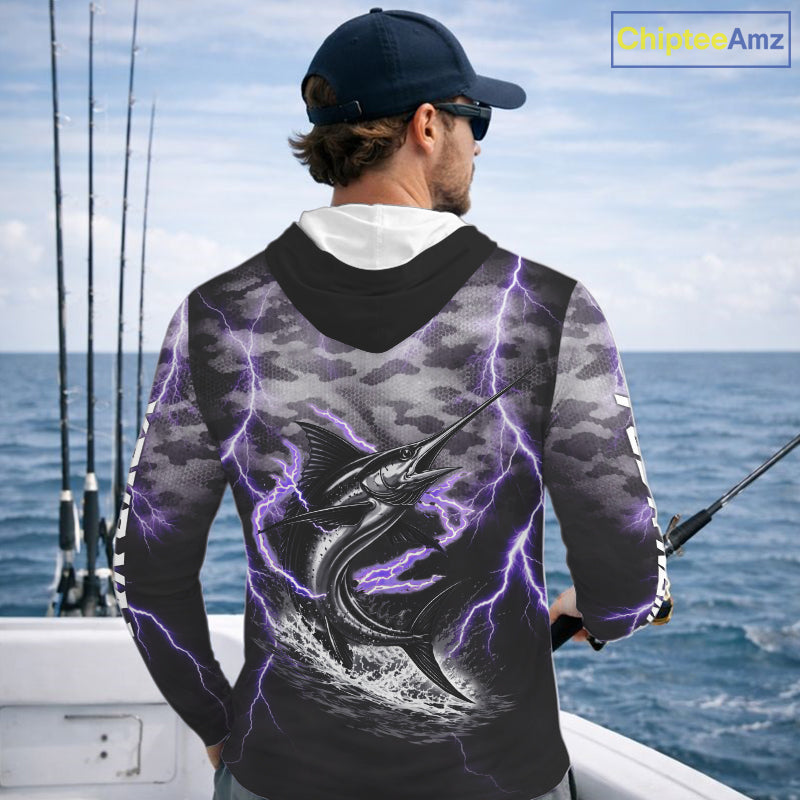 Thunder Lightning Swordfish Long Sleeve Hooded Fishing Shirts Black Camouflage, Saltwater Fishing Shirts NBT401
