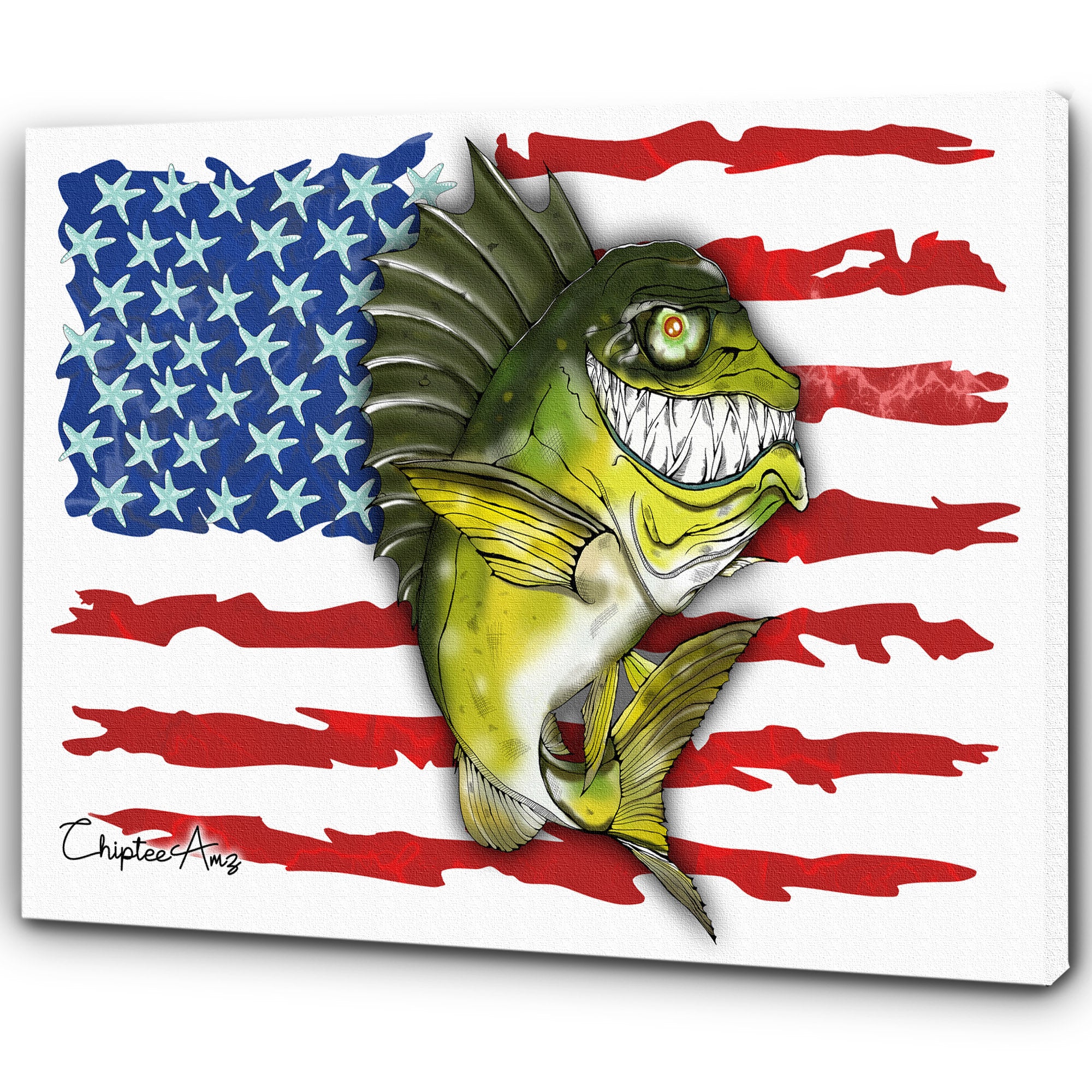 Largemouth Bass fishing art with American flag ChipteeAmz's fish art canvas AT004