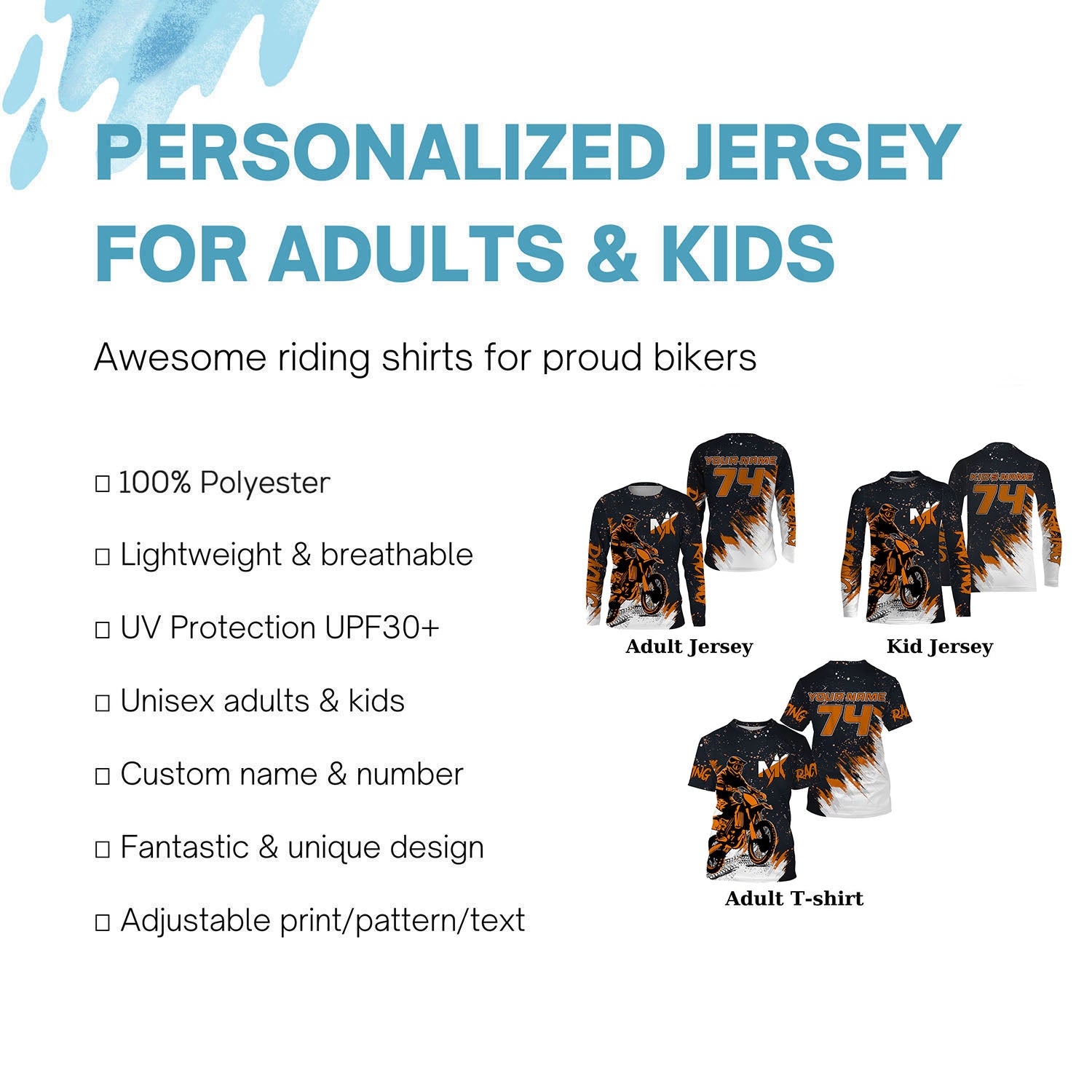 - PERSONALIZED RIDING JERSEY: This super cool shirt is exactly what all bikers are looking for. Add your name/number to make it a unique one that bears your own imprints.