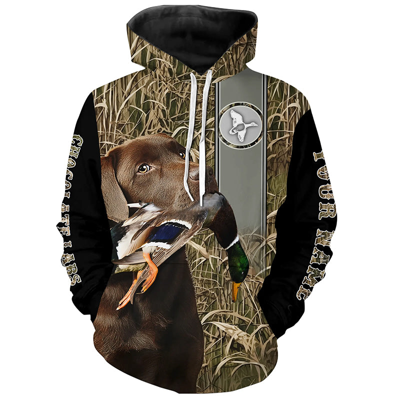 Chocolate Labrador Retriever Duck Hunting with Dog Waterfowl Camo Custom Name All Over Printed Shirts, Personalized Gifts FSD2583