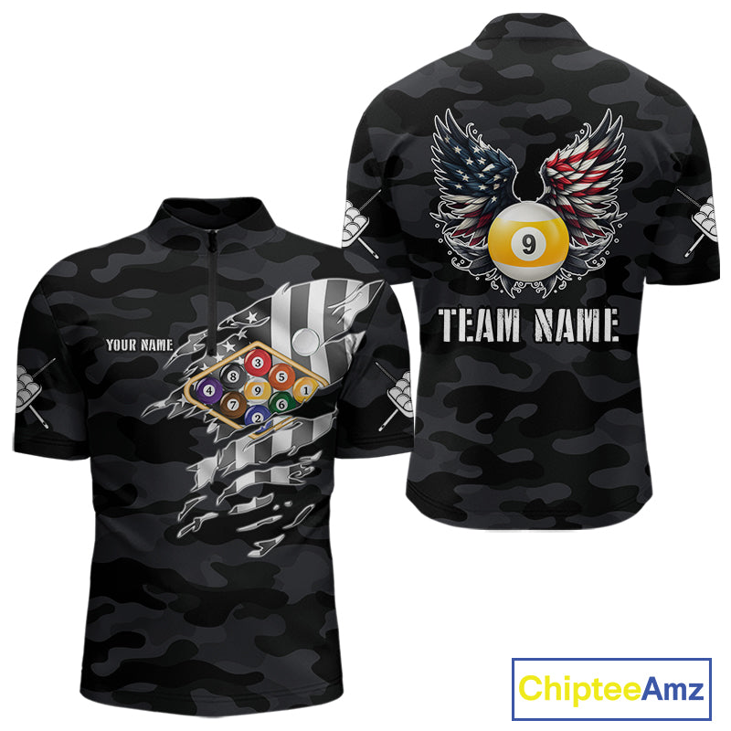 Personalized Camouflage US Flag Billiard Shirt For Men, Funny Patriotic 9 Ball Wings Pool Jersey TDM4479