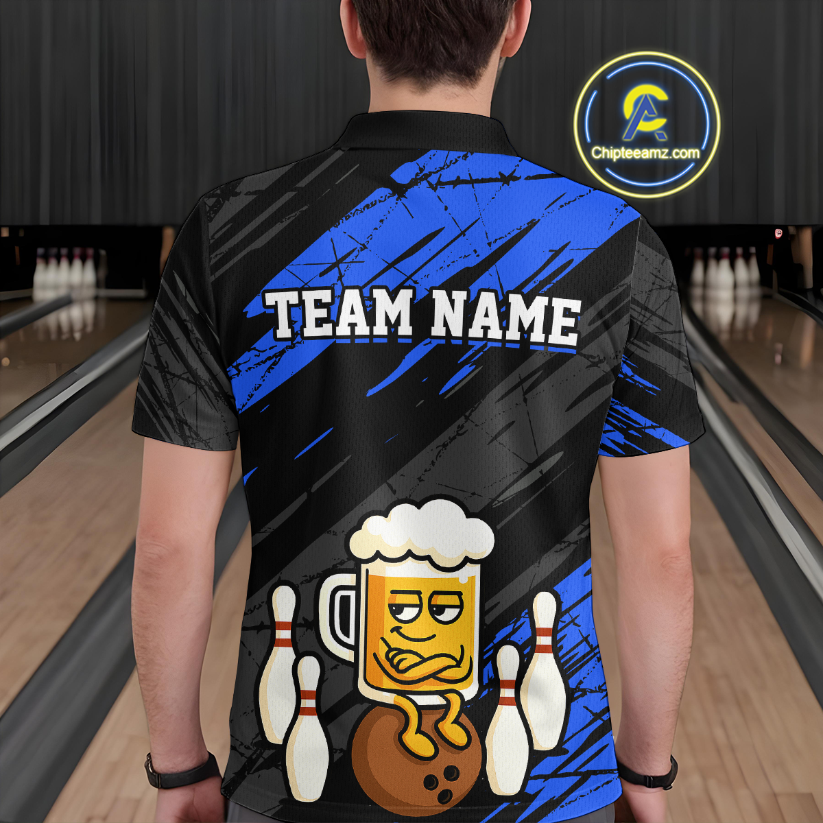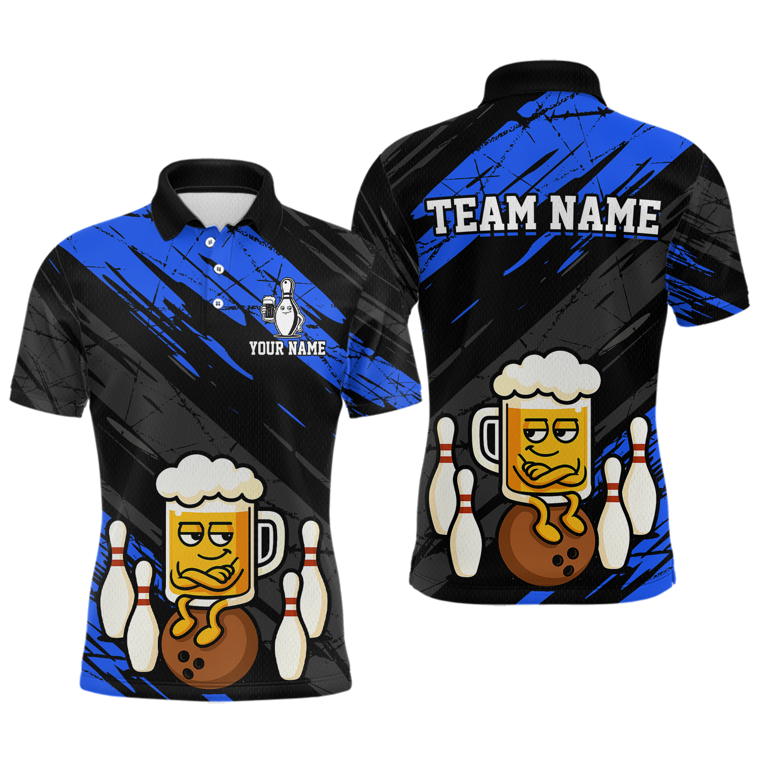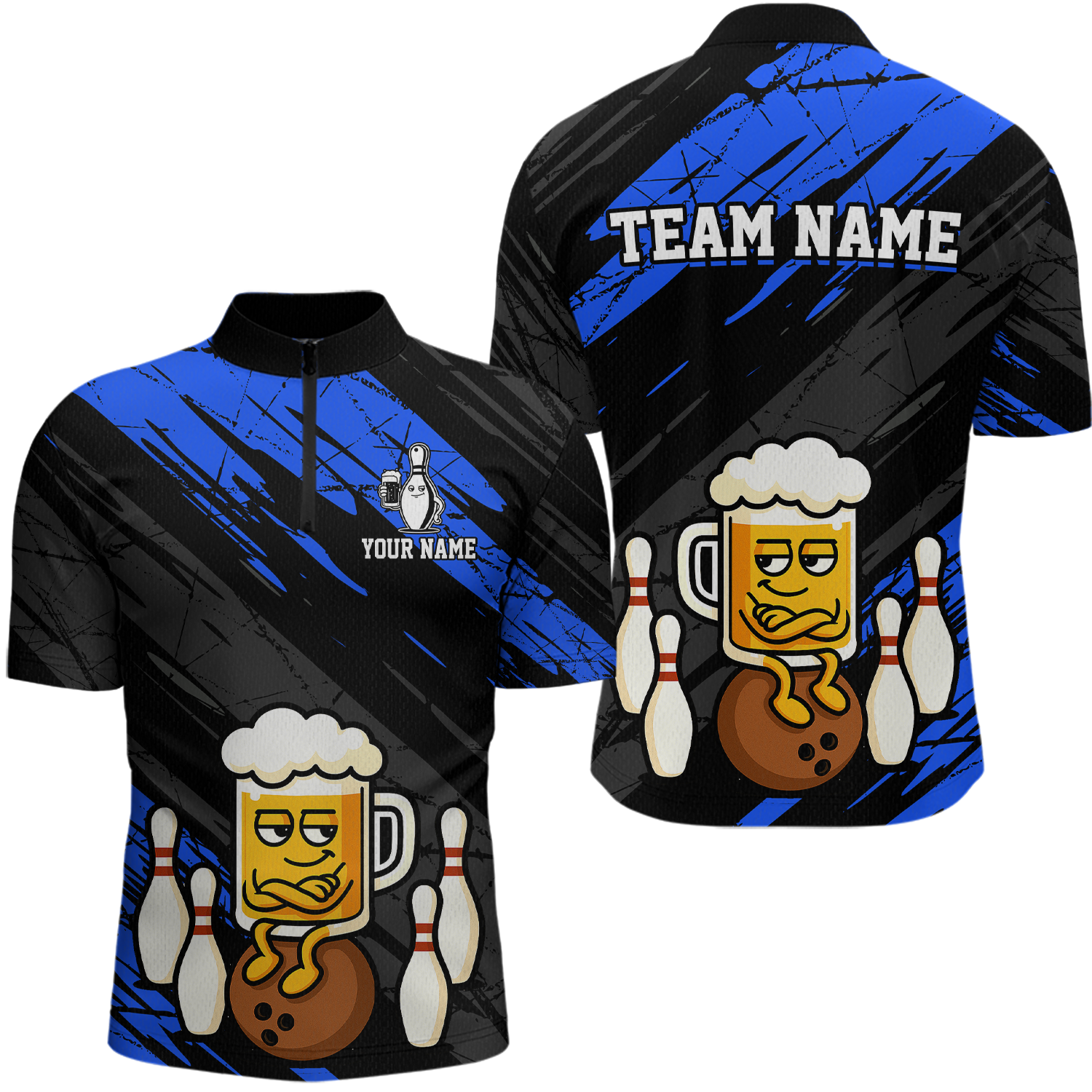 Custom Blue Funny Beer Bowling Jersey for Men Bowling Uniform Polo & 1/4 Zip Bowling Team Shirts HNT107