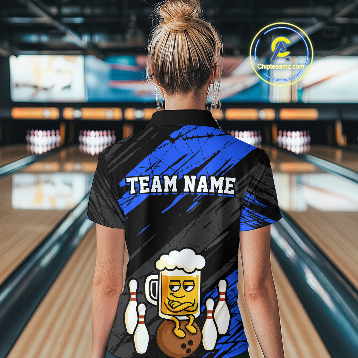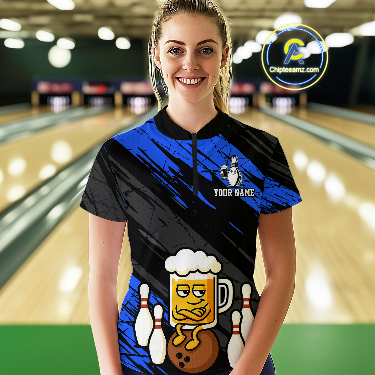 Custom Blue Funny Beer Bowling Jersey for Women Bowling Uniform Polo & 1/4 Zip Bowling Team Shirts HNT107