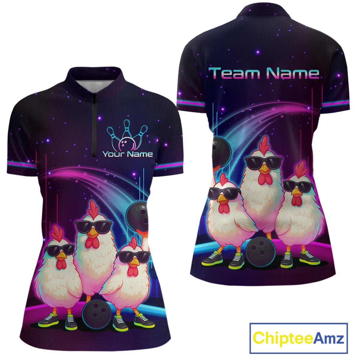 Neon Funny Family of Three Chicken Bowling Team Shirt for Women Bowling League Jersey QZT761