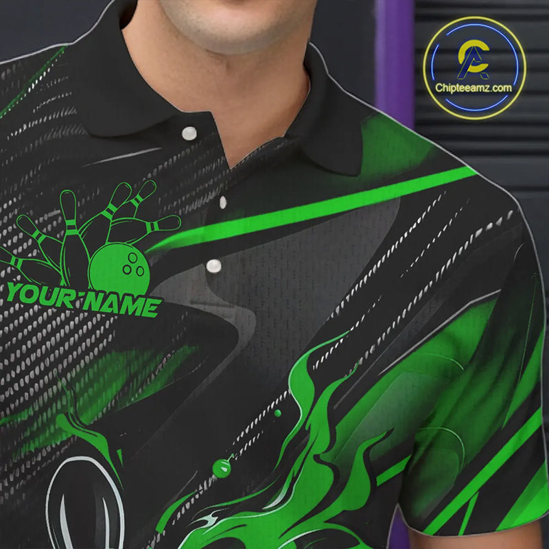 Black And Green Custom Flame Bowling Shirts For Men, Fire Bowling Team Shirt Bowler Jersey IPHW7934