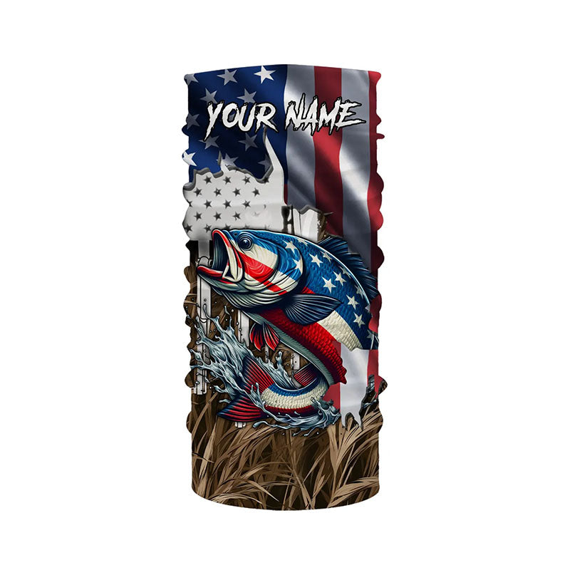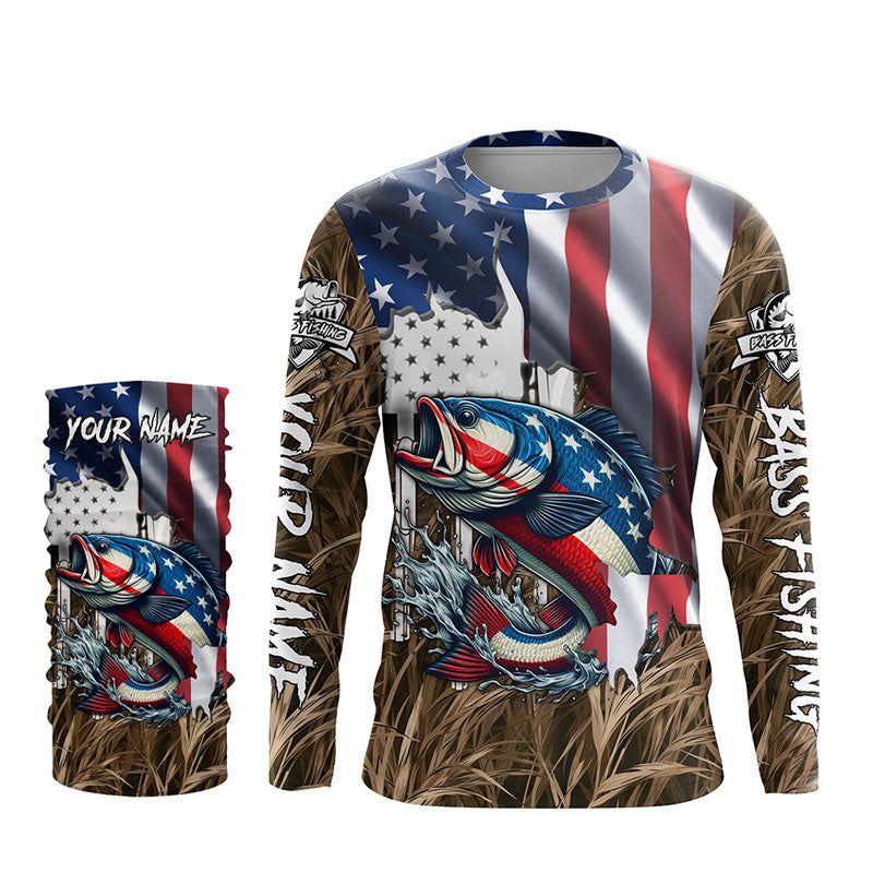 American flag patriotic Largemouth Bass camo fishing, custom mens long sleeve shirts NQS1476