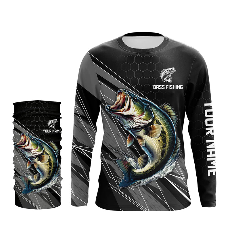 Personalized Black camo Largemouth Bass Fishing Jerseys, Bass Long Sleeve Fishing Tournament Shirts NQS8012