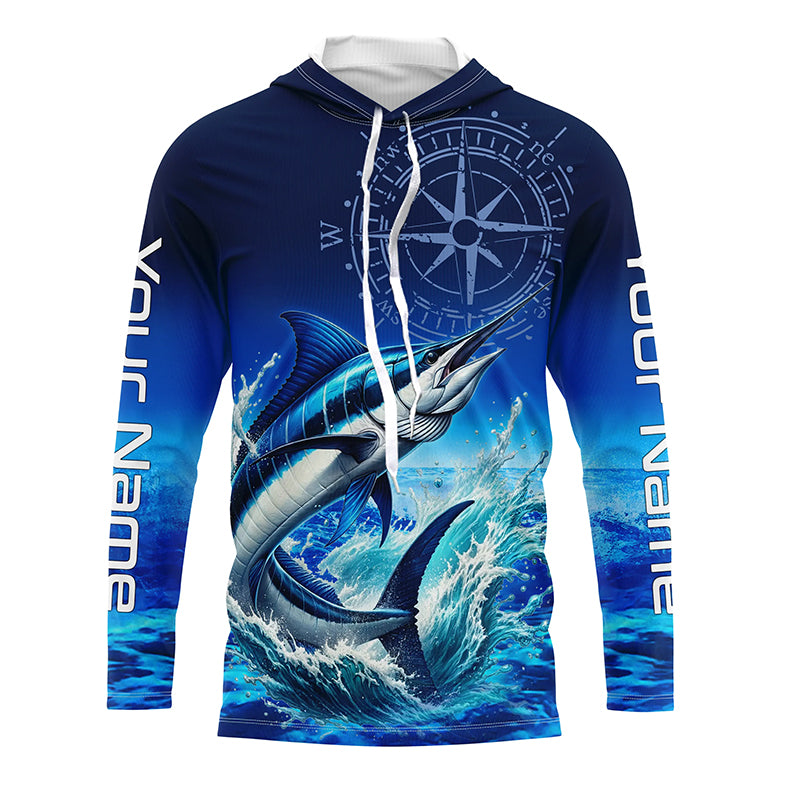 Personalized Marlin Blue Long Sleeve Performance Fishing Shirts, Marlin compass tournament Shirts NQS5816