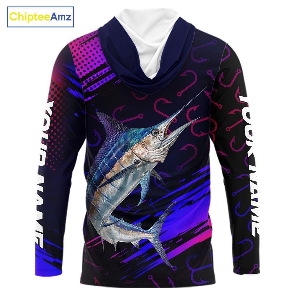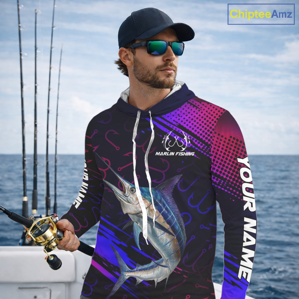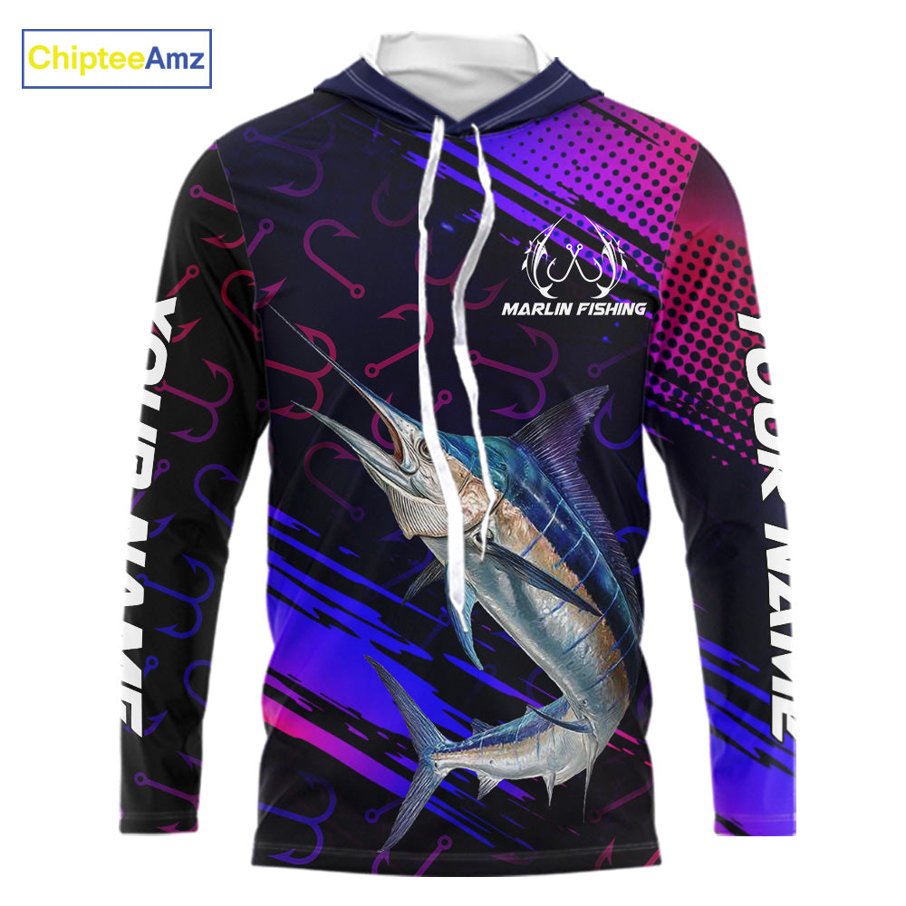 Custom Marlin Fishing Shirts with Hood Fish Hooks Long Sleeve Performance Shirt, Marlin Fishing Jersey NBT475