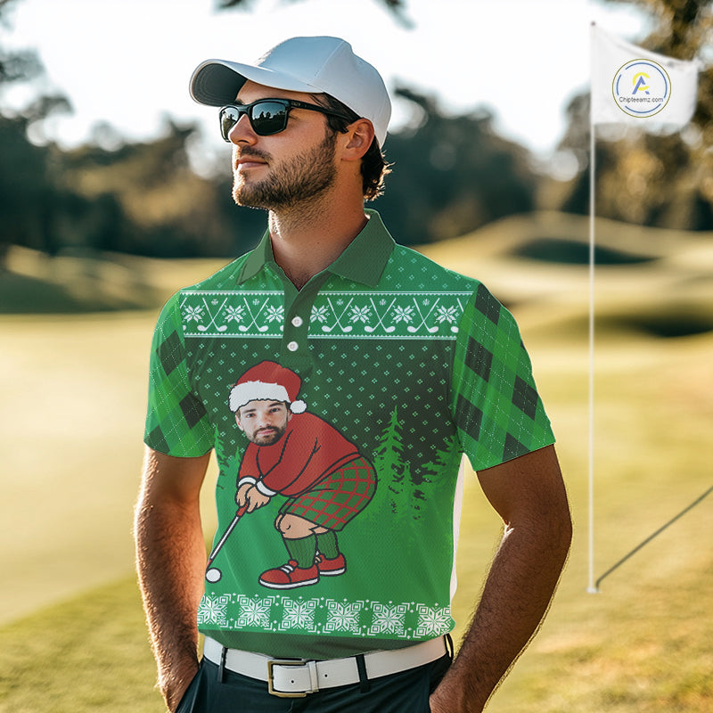 Personalized Funny Face Christmas Golf Green argyle Santa Golfer Ugly matching golf polos for couples NQS11021