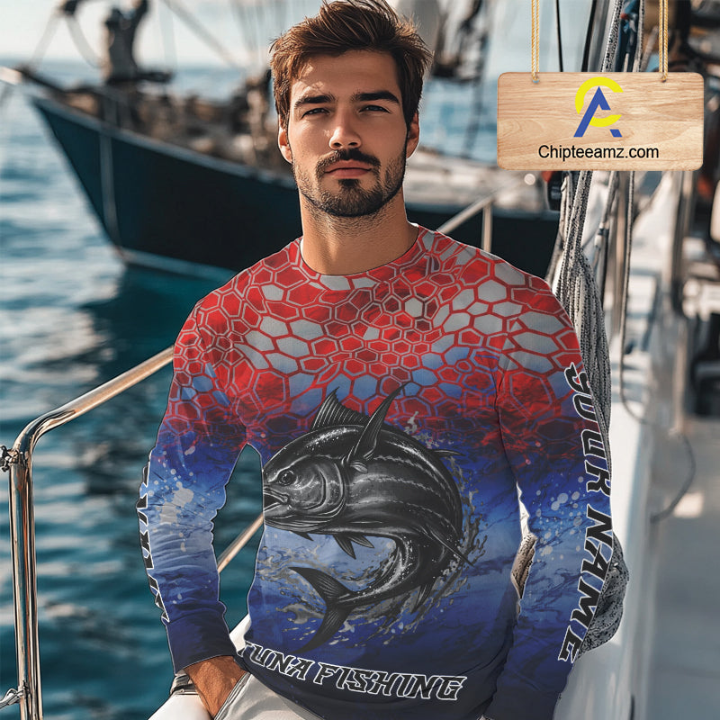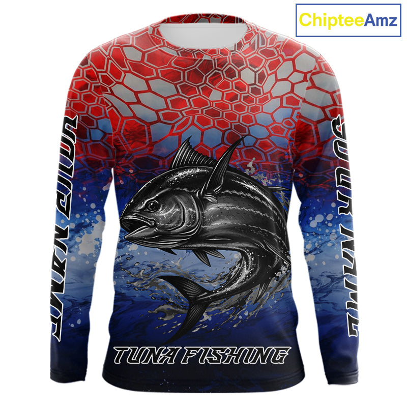 Custom Red Blue Tuna Fishing Long Sleeve Fishing Shirts, Saltwater Offshore Fishing Shirts NBT399