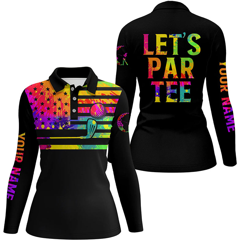 Womens golf polo shirts watercolor American flag custom name Let’s Par Tee black golf shirt NQS5427