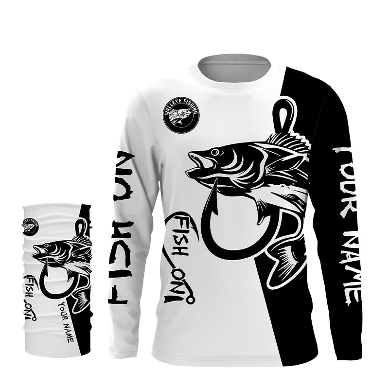 Walleye fishing tattoo fish on black white UV protection Customize name long sleeves fishing shirts NQS4216