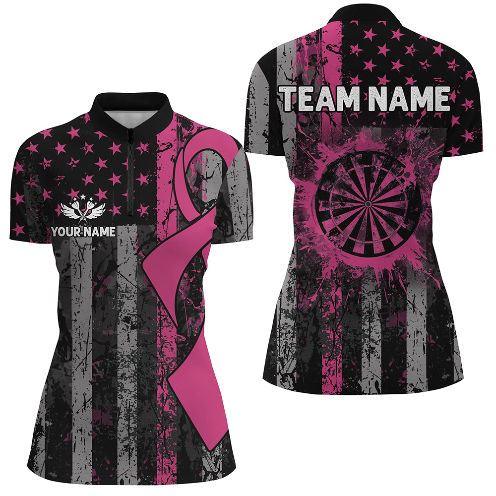 Custom Pink Ribbon Grunge American Flag Patriotic Darts Shirts For Women, Breast Cancer Darts Jerseys TDM2511