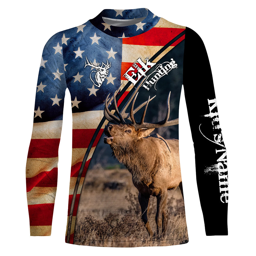 American flag Elk Hunting Shirts for Men, Custom Name Patriotic Elk Hunting Shirts FSD3007